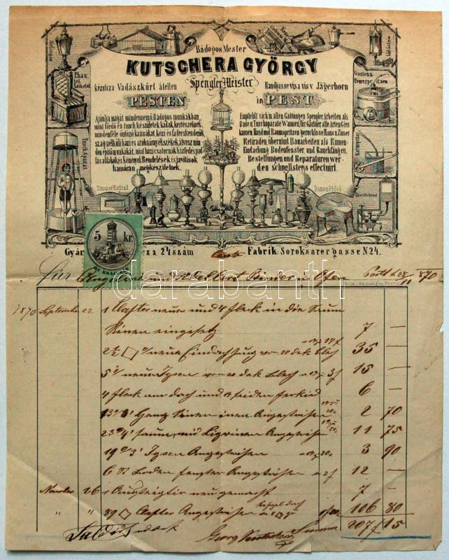 Beschreibung: 1870 Budapest V. Kutschera György bádogosmester díszes, illusztrált reklámos számlája illetékbélyeggel /