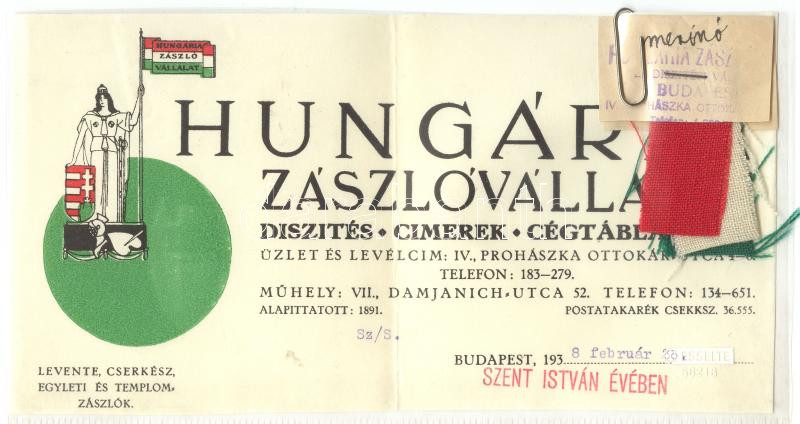 1938 Hungária zászlóvállalat reklámnyomtatvány, anygamintával https://www.darabanth.com/de/170-Fernauktion/170.0/Andere-Sammelgebiete/Werbungen~500025/1938-Hungaria-zaszlovallalat-reklamnyomtatvany-anygamintaval~II565254