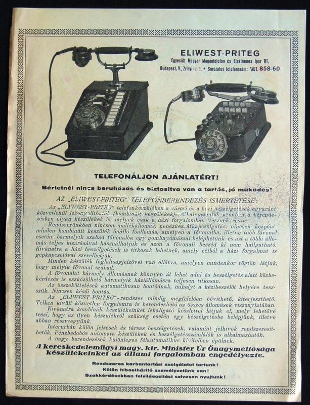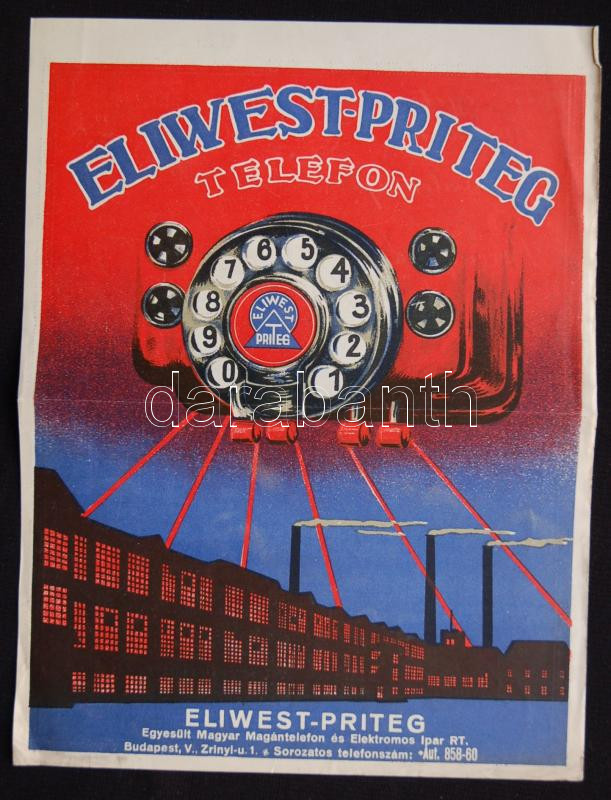 cca 1930 Eliwest-Priteg telefon reklámplakát / Commercial poster 23x30... https://www.darabanth.com/de/170-Fernauktion/170.0/Andere-Sammelgebiete/Werbungen~500025/cca-1930-Eliwest-Priteg-telefon-reklamplakat-Commercial-poster-23x30-cm~II511434