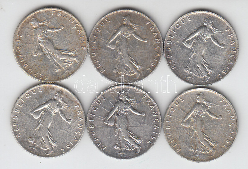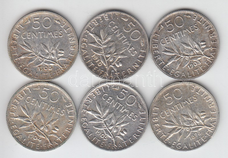 Franciaország 1889. 50c Ag + 1903. 50c Ag + 1904. 50c Ag + 1905. 50c Ag + 1908. 50c Ag + 1910. 50c Ag T:2