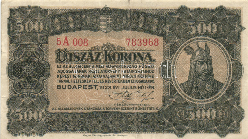 Beschreibung: 1923. 500K "Magyar Pénzjegynyomda Rt.." T:III