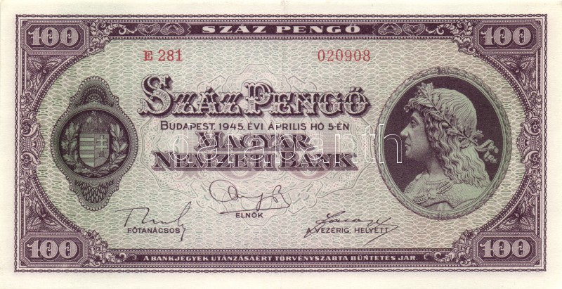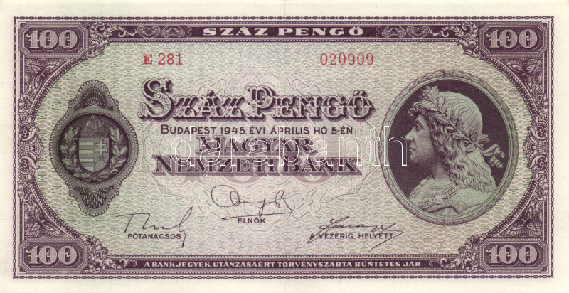 Beschreibung: 1945. 100P (4x) egymás utáni sorszámmal T:II,II-