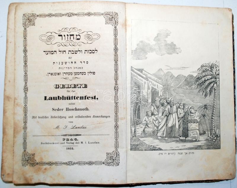 Gebete für das Laubhüttenfest nebst Seder Hoschanoth. Mit deutscher Uebersetzung und erläuternden Anmerkungen von M. I. Landau. Prag, 1854, Verlag des M. I. Landau. Héber-német kétnyelvű imádságos könyv dombornyomott, kopottas félbőr kötésben, a címlapon fametszettel /