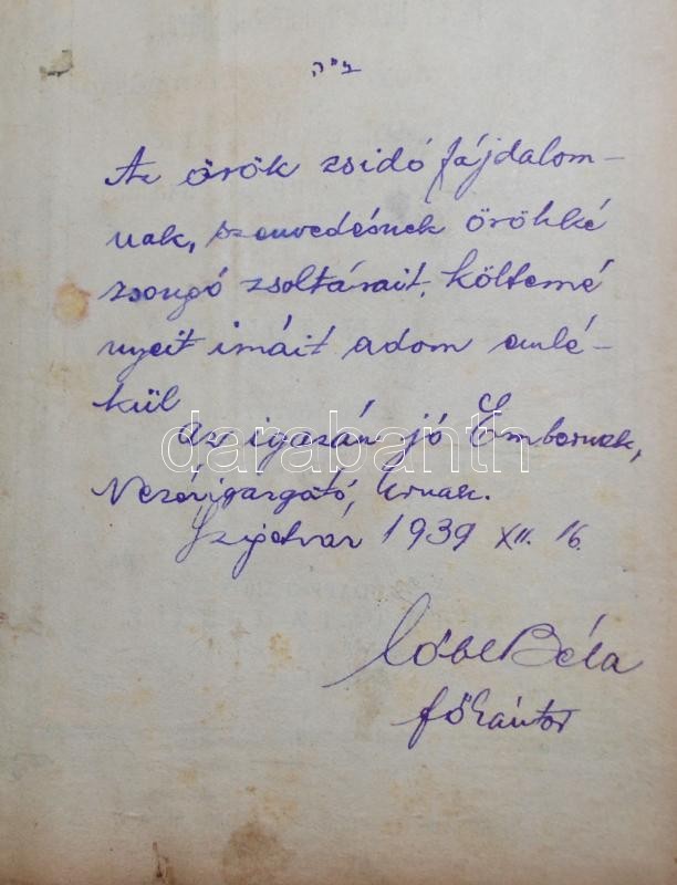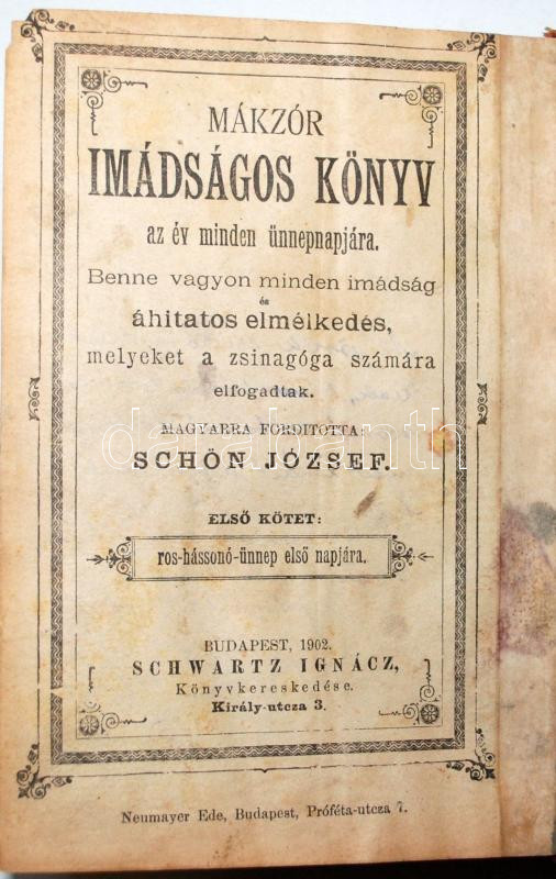 Mákzór imádságos könyv az év minden ünnepnapjára... Magyarra fordította: Schön József. I. köt.: ros-hássonó-ünnep első napjára. Bp., 1902, Schwartz Ignácz. Kétnyelvű magyar-héber imádságos könyv egészvászon kötésben, a címlapon ajándékozó sorokkal