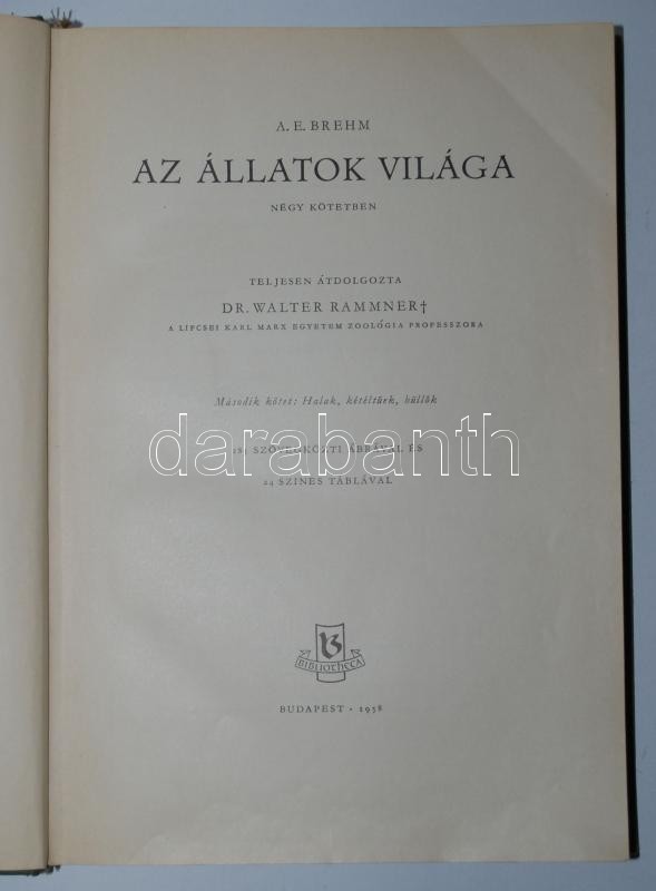 A. E. Brehm: Az állatok világa II. köt. Teljesen átdolgozta dr. Walter Rammner. 285 szövegközti ábrával és 24 színes táblával. Bp., 1958, Bibliotheca. Kiadói egészvászon kötésben, jó állapotban
