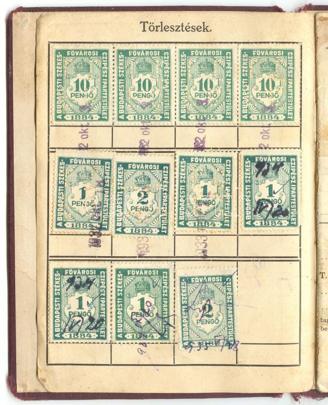 Beschreibung: 1932 Budapest székesfővárosi czipész ipartestület tagsági könyve, tagsági bélyegekkel, elvált állapotban