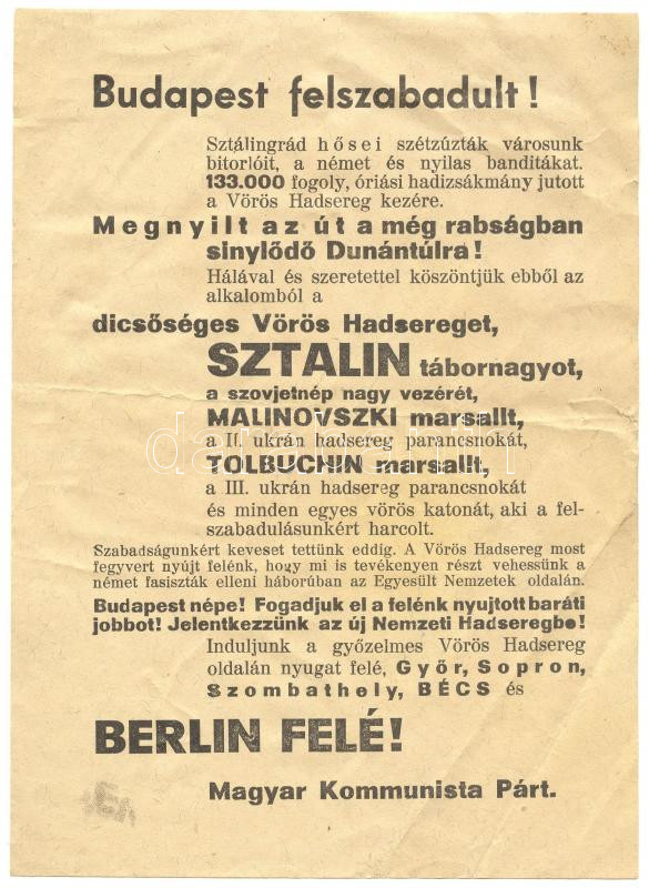 1945 Budapest felszabadult, szórólap, apró szakadás https://www.darabanth.com/de/171-Fernauktion/171.0/Andere-Sammelgebiete/Drucksachen~1000005/1945-Budapest-felszabadult-szorolap-apro-szakadas~II579005