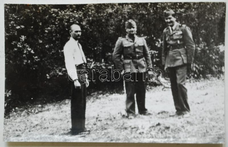Beschreibung: 1942. július Kurszk; Horthy István kormányzóhelyettes, Fejér László tart. zászlós és Kiss Zoltán főhadnagy, fotó (13 × 8.5 cm)