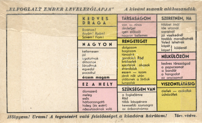 Elfoglalt ember levelezőlapja / A busy man´s postcard, multiple choice... https://www.darabanth.com/de/171-Fernauktion/171.0/Ansichtskarten/Humor~1000126/Elfoglalt-ember-levelezolapja-A-busy-mans-postcard-multiple-choice-card~II576817