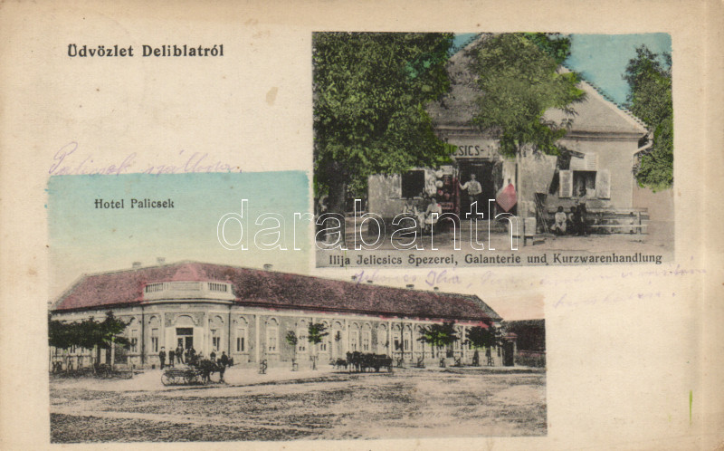 Deliblát Hotel Palicsek, Shop of Illja Jelicsics (EK) https://www.darabanth.com/de/171-Fernauktion/171.0/Ansichtskarten/Vojvodina~500012/Deliblat-Hotel-Palicsek-Shop-of-Illja-Jelicsics-EK~II580482