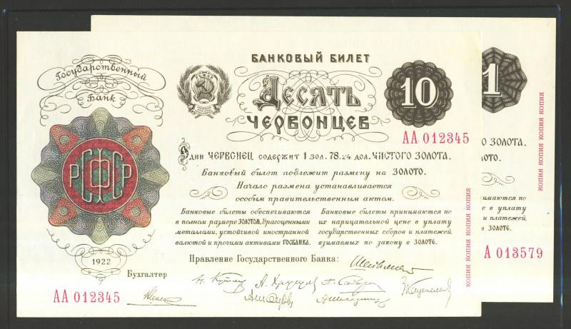 Soviet Union 1922. 1 Chervontsev + 10 Chervontsev copies C:Unc