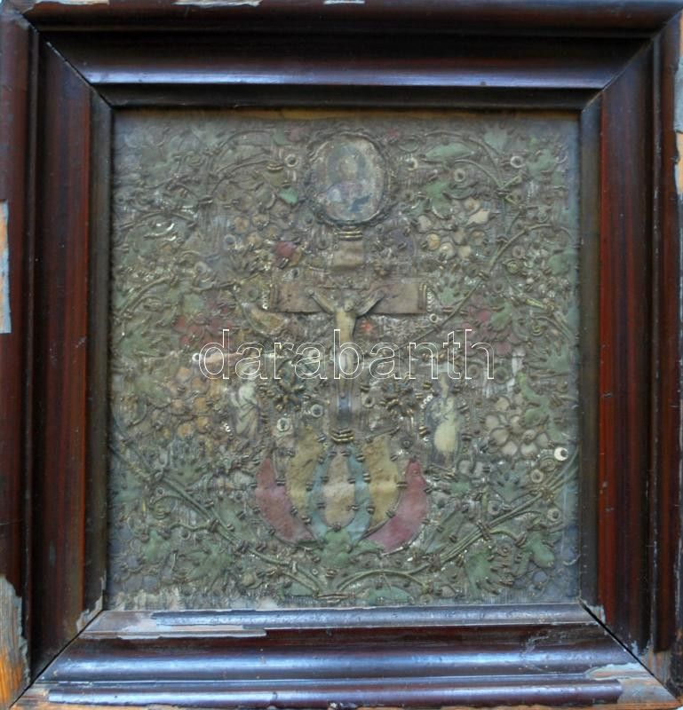 Beschreibung: Krisztus a kereszten cca 1900, kézzel készített textil, fém alkotás, jelzés nélküli, apró hibákkal, üvegezett sérült keretben