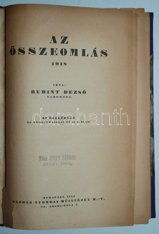 Rubint Dezső tábornok: Az összeomlás 1918. 63 melléklet (40 okmánymáso... https://www.darabanth.com/de/172-Fernauktion/172.0/Andere-Sammelgebiete/Bucher-Militaria~500033/Rubint-Dezso-tabornok-Az-osszeomlas-1918-63-melleklet-40-okmanymasolat-es-23-vazlat-Bp~II581406