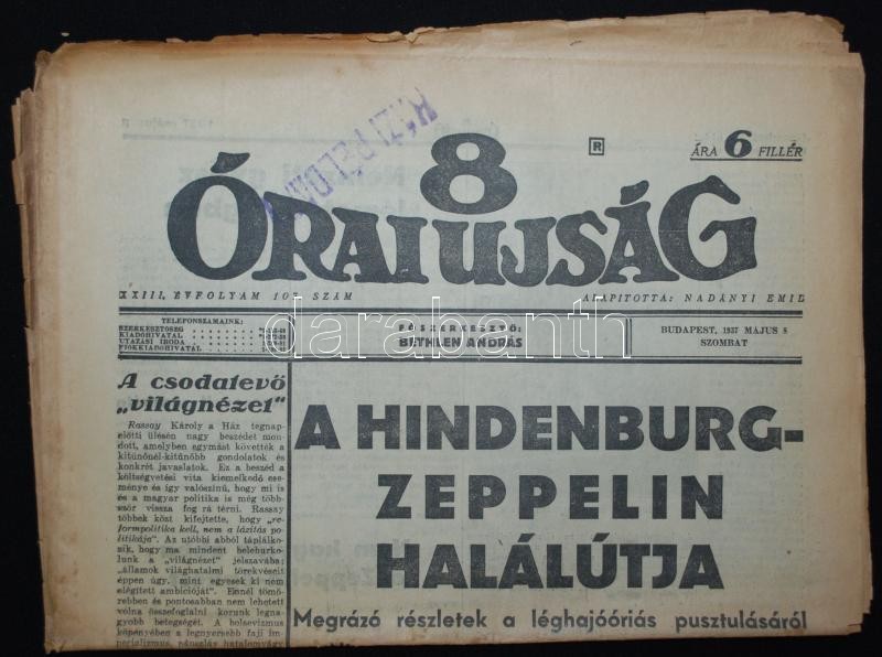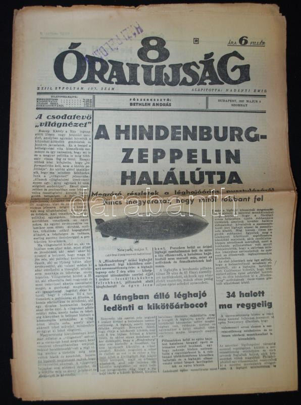 1937 A 8 órai újság május 8.-i száma a Hindenburg zeppelin katasztrófá... https://www.darabanth.com/de/172-Fernauktion/172.0/Andere-Sammelgebiete/Drucksachen~500024/1937-A-8-orai-ujsag-majus-8-i-szama-a-Hindenburg-zeppelin-katasztrofajarol-szolo-tudosC3~II573373