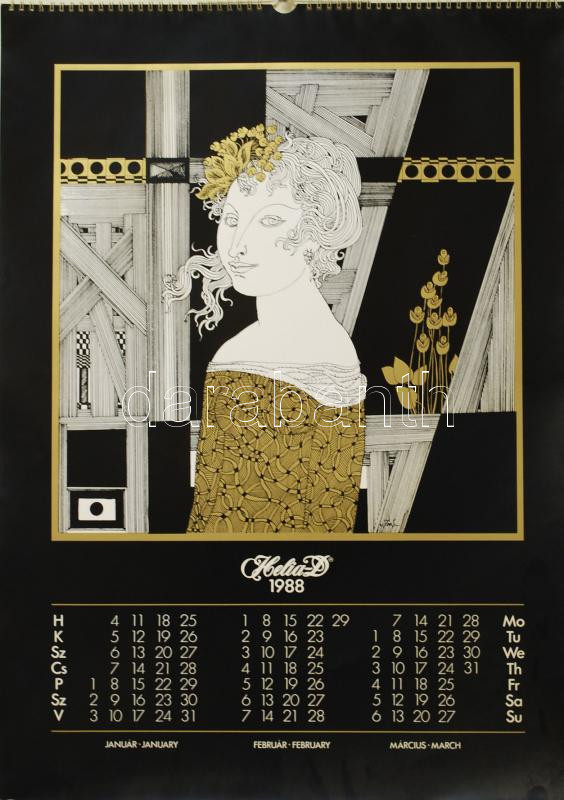 Beschreibung: Szász Endre, Helia-D számára készített album naptára 1988, teljes, 67×48 cm, 3 oldalas