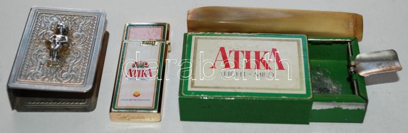 Beschreibung: Dohányzó eszközök: Atika márkájú cigarettát reklámozó zsebhamutartó és öngyújtó, belgiumi szuvenír fém gyufatartó, szaruszipka /