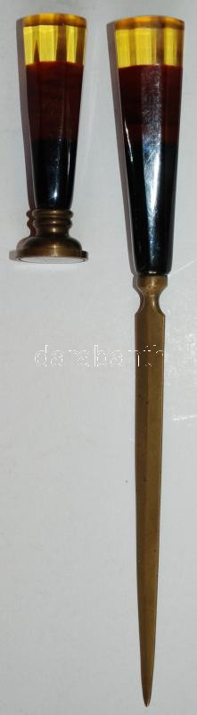Réz papírvágó kés és pecsétnyomó színes műanyag nyéllel /