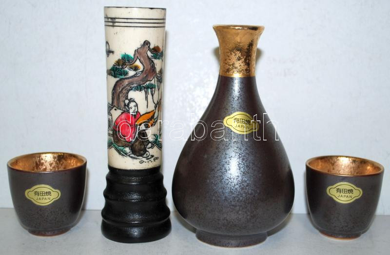 Hand painted Japanese bone vase and a porcelain sake set, 13cm, 12cm, 4cm