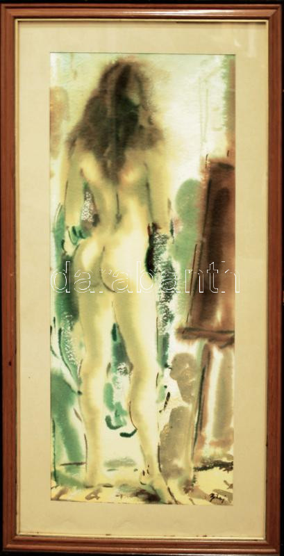 Beschreibung: Bihari Sándor (1947): Műteremben, akvarell, pasztell, papír, jelzett, üvegezett keretben, 87x46cm