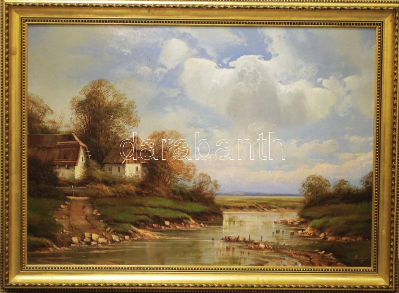 Beschreibung: Radnai József (1958): Vidéki nyugalom. Olaj, farost, jelzett, igényes fakeretben, 84x114cm