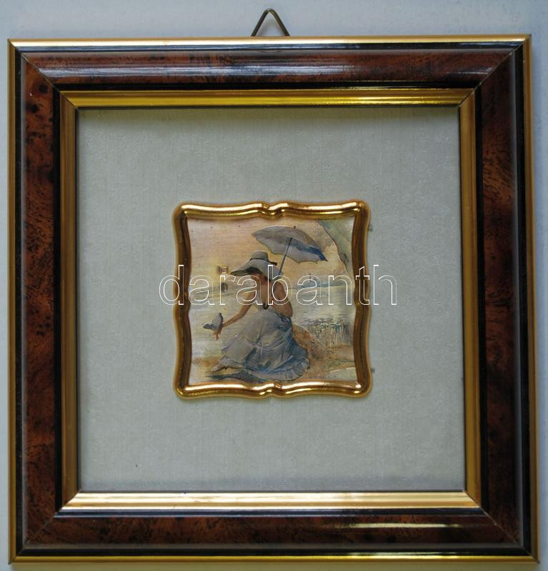 Beschreibung: Napernyős hölgy a galambbal, színezett ezüst kép, jelzett (ezüstjel), szép üvegezett keretben