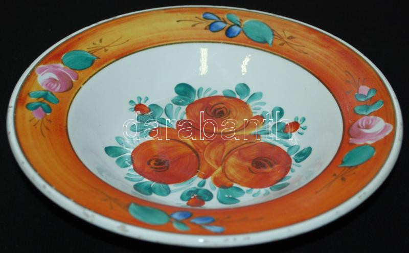 Beschreibung: cca 1900 Virággal díszített Hollóháza kerámia falitányér, kézzel festett, jelzett (házon a holló), apró lepattogzással, ritka d: 23 cm