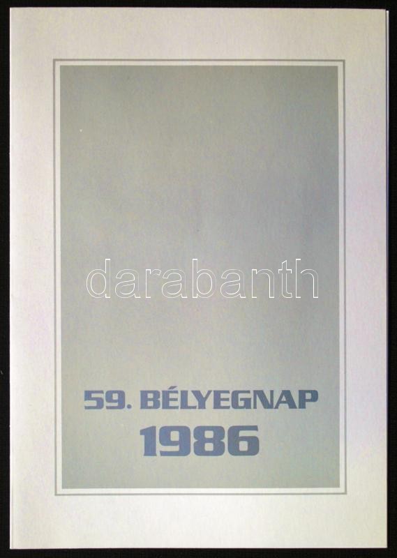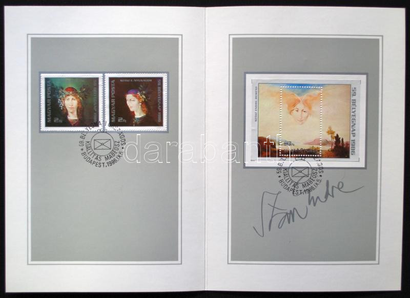 Beschreibung: 1986 Bélyegnap alkalmi bélyegzésű üdvözlőlap a tervező Szász Endre saját kezű aláírásával