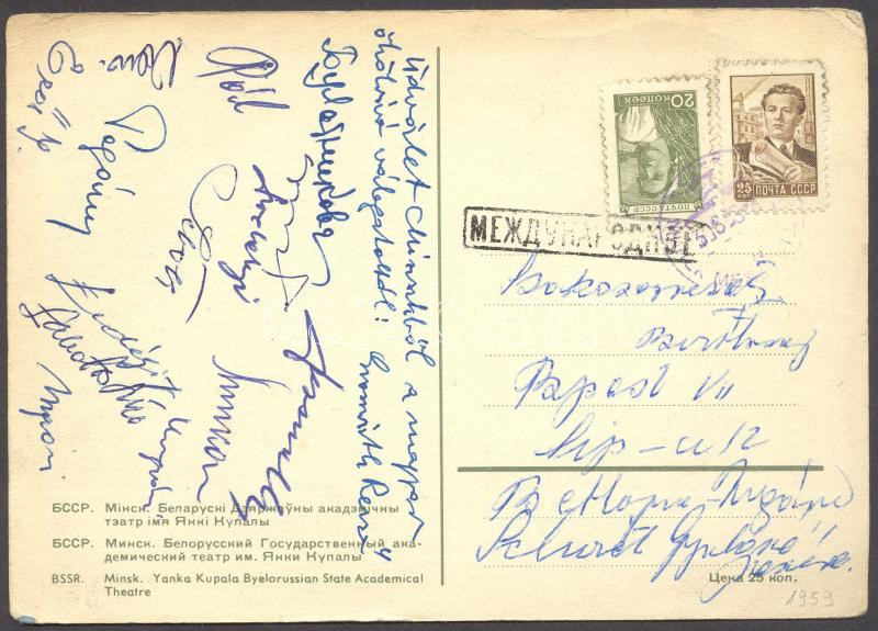 Beschreibung: cca 1955 A magyar férfi ökölvívó-válogatott tagjainak aláírása képeslapon Minszkből