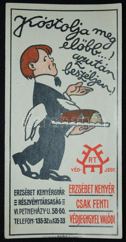 Erzsébet kenyérgyár számolócédula https://www.darabanth.com/de/172-Fernauktion/172.0/Andere-Sammelgebiete/Werbungen~500019/Erzsebet-kenyergyar-szamolocedula~II587153