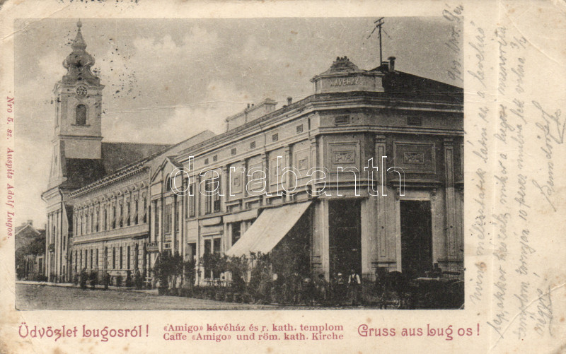 Lugos Café Amigo, Catholic church (fa) https://www.darabanth.com/de/172-Fernauktion/172.0/Ansichtskarten/Siebenburgen~5000006/Lugos-Cafe-Amigo-Catholic-church-fa~II582441