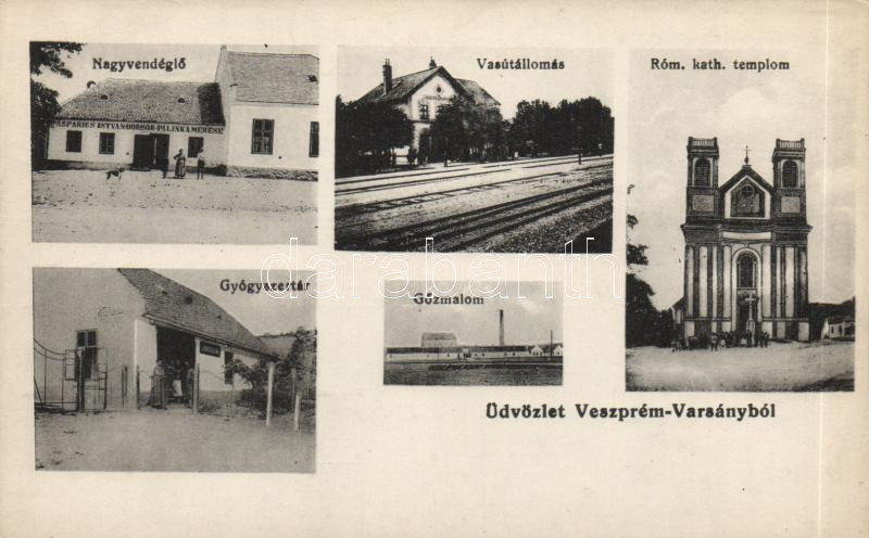Beschreibung: Veszprémvarsány vasútállomás, gyógyszertár, Gasparics István nagyvendéglője, gőzmalom