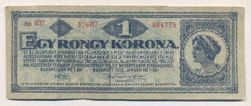 1920. 1K-ból összeragasztott "Egy Rongy Korona" korabeli humor T:III https://www.darabanth.com/de/172-Fernauktion/172.0/Numismatik/Ungarische-banknoten~5000105/1920-1K-bol-osszeragasztott-Egy-Rongy-Korona-korabeli-humor-TIII~II587760