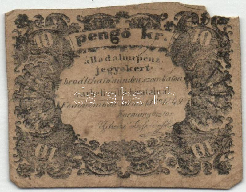 1849. Komárom 10Kr T:III-,IV https://www.darabanth.com/de/172-Fernauktion/172.0/Numismatik/Ungarische-und-Auslandische-Notgelden~5000104/1849-Komarom-10Kr-TIII-IV~II586857