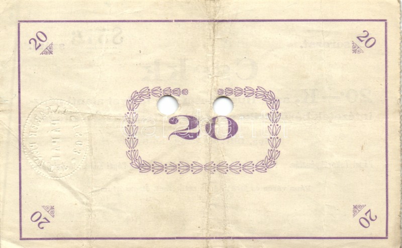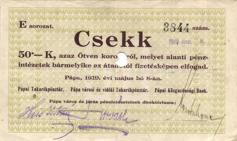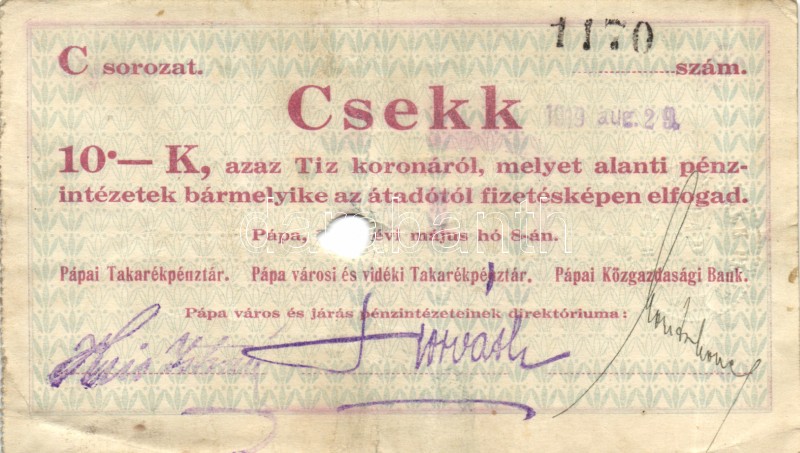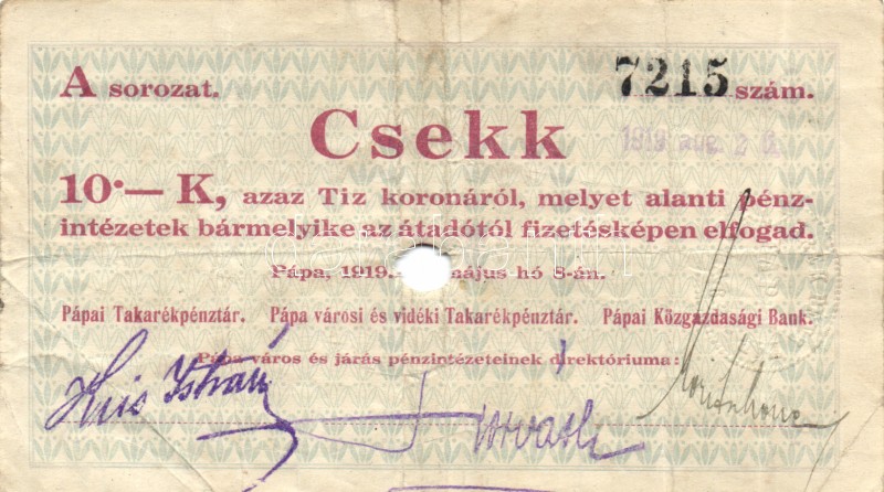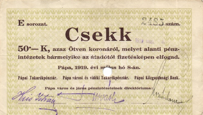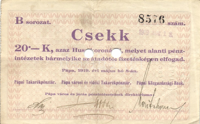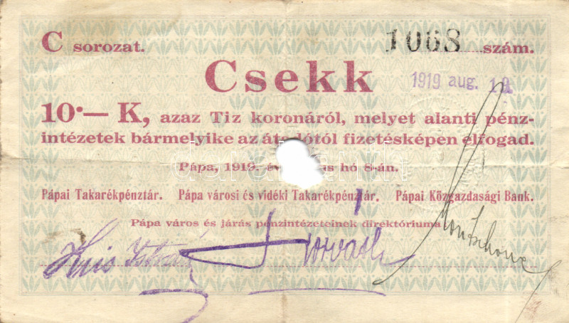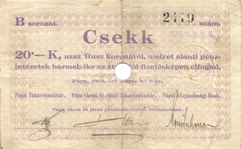 Pápa 1919.május 8. "Pápai csekk" 10K (3x) + 20K (3x) + 50K (3x) lyukas... https://www.darabanth.com/de/172-Fernauktion/172.0/Numismatik/Ungarische-und-Auslandische-Notgelden~5000104/Papa-1919majus-8-Papai-csekk-10K-3x-plus-20K-3x-plus-50K-3x-lyukasztassal-ervenytelenitve~II581792