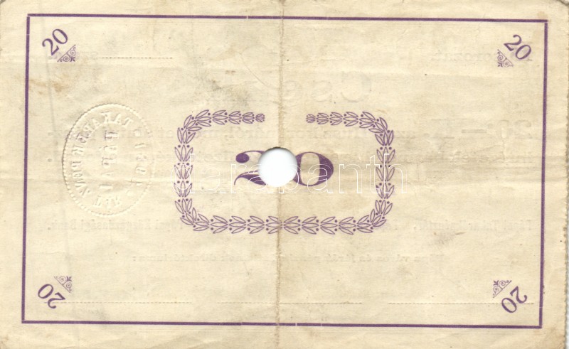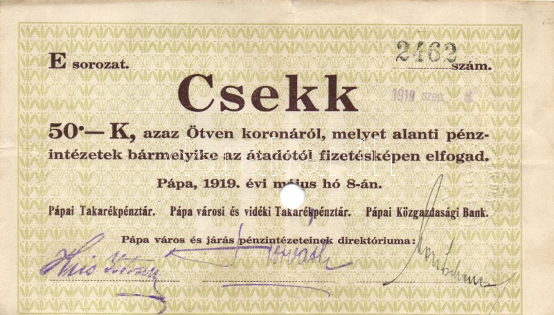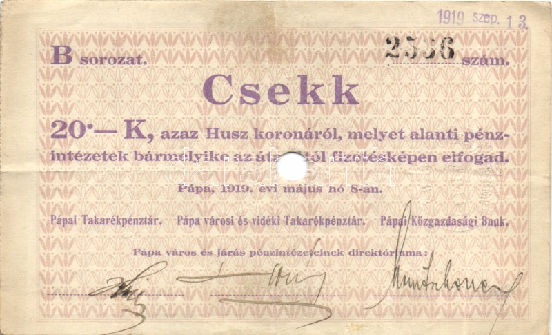 Beschreibung: Pápa 1919.május 8. "Pápai csekk" 10K (3x) + 20K (3x) + 50K (3x) lyukasztással érvénytelenítve T:II,III