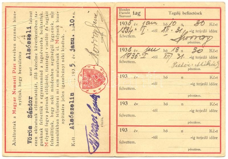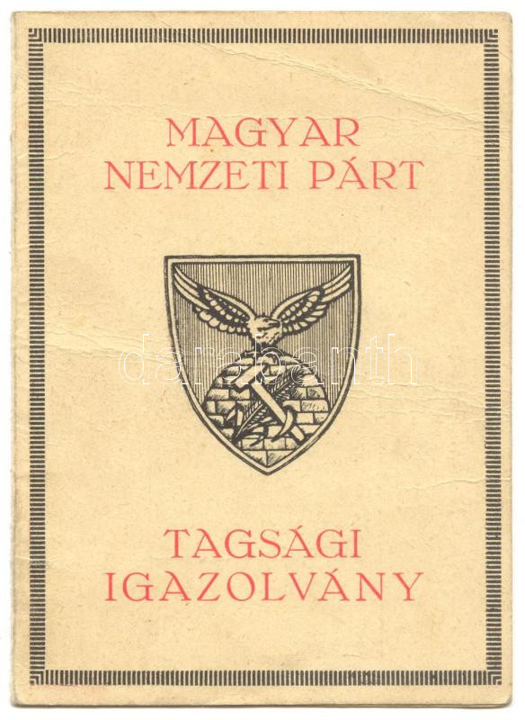 1935 A Magyar Nemzeti Párt tagsági igazolványa https://www.darabanth.com/de/173-Fernauktion/173.0/Andere-Sammelgebiete/Dokument~4000024/1935-A-Magyar-Nemzeti-Part-tagsagi-igazolvanya~II589049