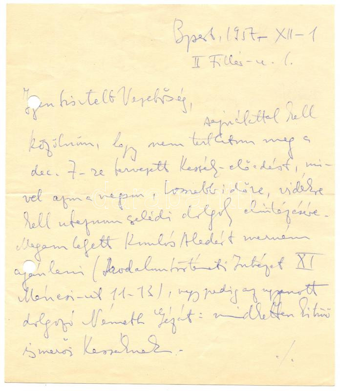 Beschreibung: 1957 Gyergyai Albert magyar irodalomtörténész, író saját kézzel írt levele, melyben megtartandó Kassák-előadását mondja le