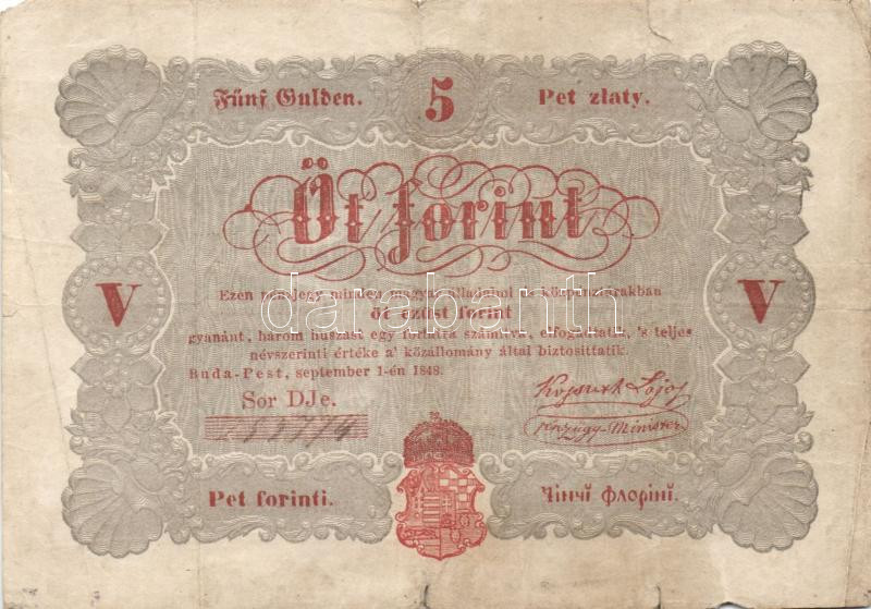 1848. 5Ft "Kossuth bankó" piros T:III https://www.darabanth.com/de/173-Fernauktion/173.0/Numismatik/Ungarische-banknoten~4000126/1848-5Ft-Kossuth-banko-piros-TIII~II593433