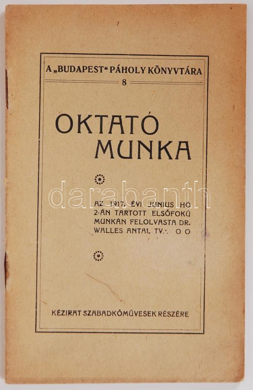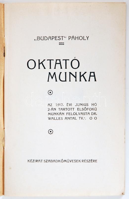 A "Budapest" Páholy Könytára: Walles Antal tv.: Oktató munka. 1917, Ké... https://www.darabanth.com/de/174-Fernauktion/174.0/Andere-Sammelgebiete/Bucher-Freimauer~2200022/A-Budapest-Paholy-Konytara-Walles-Antal-tv-Oktato-munka-1917-Kezirat-szabadkomuvesek-r~II601963