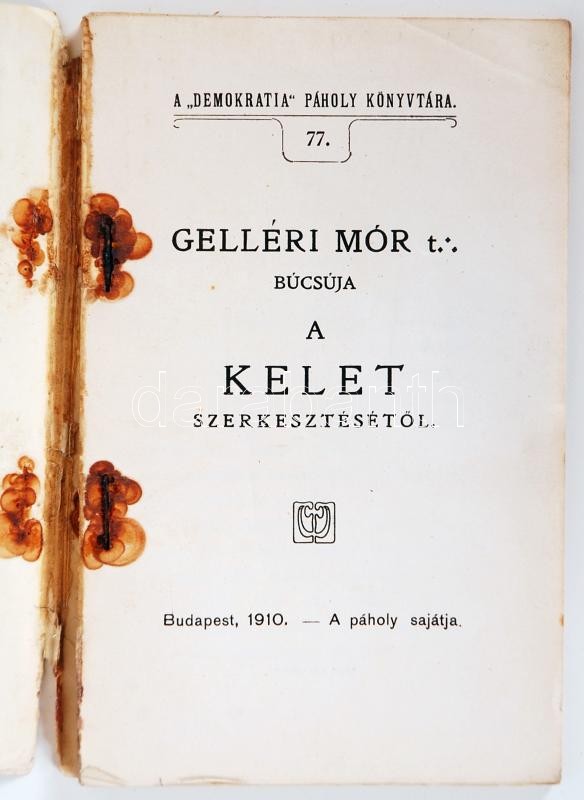 "Demokrata"-Páholy Könyvtára: Gelléri Mór t.: Búcsúja a Kelet szerkesz... https://www.darabanth.com/de/174-Fernauktion/174.0/Andere-Sammelgebiete/Bucher-Freimauer~2200022/Demokrata-Paholy-Konyvtara-Gelleri-Mor-t-Bucsuja-a-Kelet-szerkesztesetol-Bp-1910-~II601959