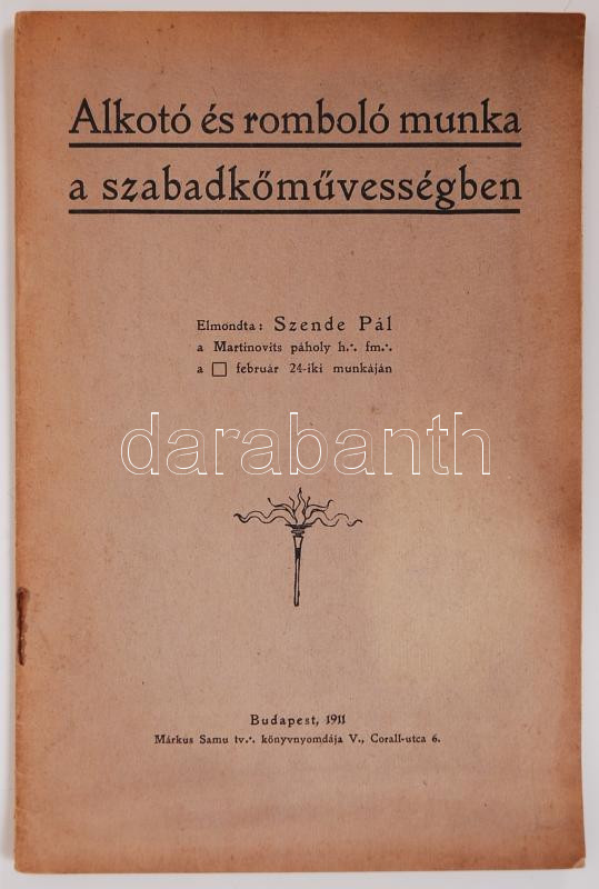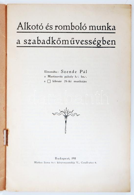 Szende Pál: Alkotó és romboló munka a szabadkőművességben. Bp., 1911, ... https://www.darabanth.com/de/174-Fernauktion/174.0/Andere-Sammelgebiete/Bucher-Freimauer~2200022/Szende-Pal-Alkoto-es-rombolo-munka-a-szabadkomuvessegben-Bp-1911-Markus-Samu-Tv-Konyv~II601964