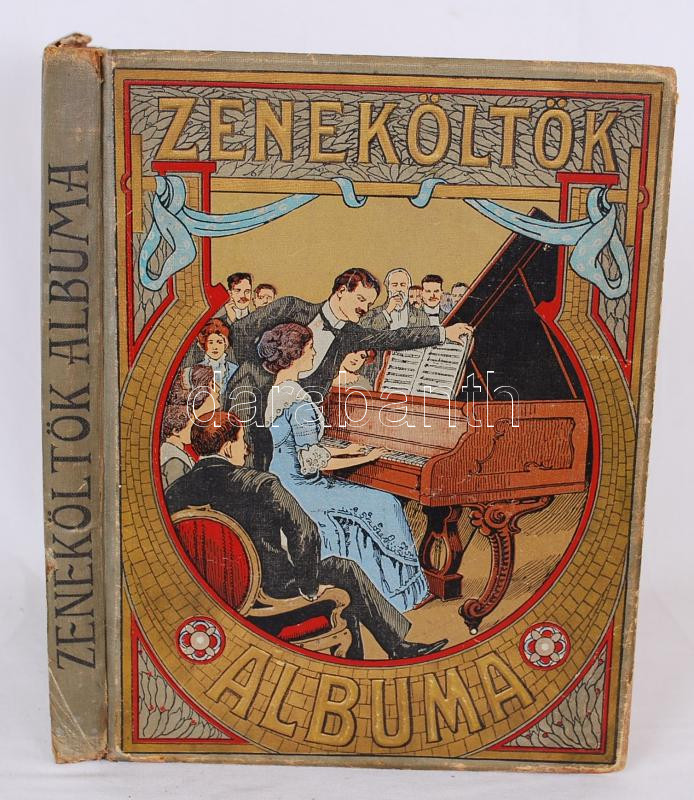 Zeneköltők albuma. Operettek, szalonpiécek, táncok, dalok, cabaret-számok és kuplék gyűjteménye. Bp., é.n., Magyar Kereskedelmi Közlöny Hírlap- és Könyvkiadó Vállalat. Kiadói szecessziós, festett, dombornyomott egészvászon kötésben, jó állapotban (gerincen kis hibákkal) /
