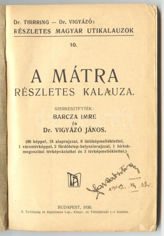 Beschreibung: Barcza Imre és Dr. Vigyázó János: Mátra. Részletes magyar útikalauzok sorozatából. Budapest 1930.