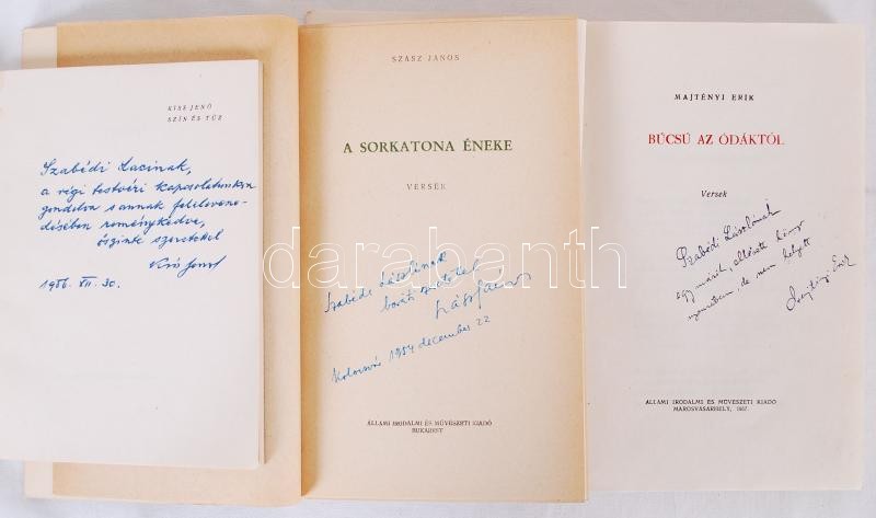 Beschreibung: Kiss Jenő, Szász János, Majtényi Erik, Holló Ernő romániai magyar költők Szabédi Lászlónak dedikált verseskötetei (5db)