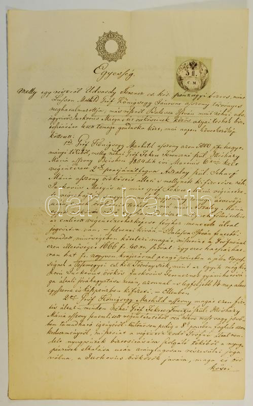 1854 15kr szignetta + 5fl CM okmánybélyeg teljes okmányon https://www.darabanth.com/de/174-Fernauktion/174.0/Andere-Sammelgebiete/Dokument~2200015/1854-15kr-szignetta-plus-5fl-CM-okmanybelyeg-teljes-okmanyon~II596248