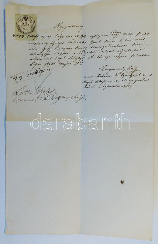 1856 Nyugta 5Ft C.M. okménybélyeggel https://www.darabanth.com/de/174-Fernauktion/174.0/Andere-Sammelgebiete/Dokument~2200015/1856-Nyugta-5Ft-CM-okmenybelyeggel~II596236