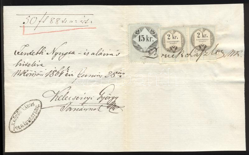 Beschreibung: 1864 Nyugta 15kr okmánybélyeg + 2x 2kr Hirdetménybélyeg vegyes felhasználásával