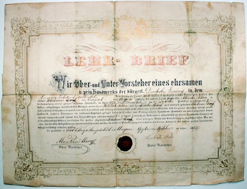 1872 A Pesti ipartestület mesterlevele faesztergályos részére pecsétte... https://www.darabanth.com/de/174-Fernauktion/174.0/Andere-Sammelgebiete/Dokument~2200015/1872-A-Pesti-ipartestulet-mesterlevele-faesztergalyos-reszere-pecsettel-58x46-cm~II586259