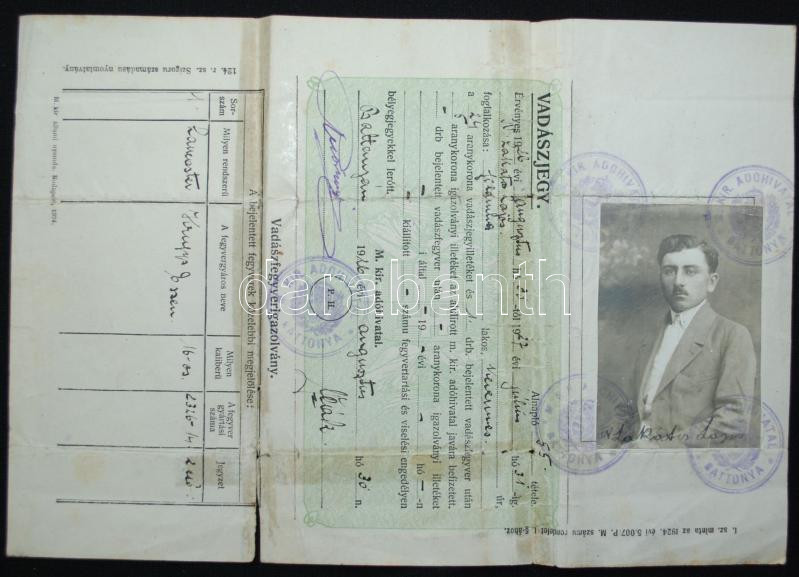 1926 Fényképes vadászjegy vadászfegyverigazolvánnyal https://www.darabanth.com/de/174-Fernauktion/174.0/Andere-Sammelgebiete/Dokument~2200015/1926-Fenykepes-vadaszjegy-vadaszfegyverigazolvannyal~II560646