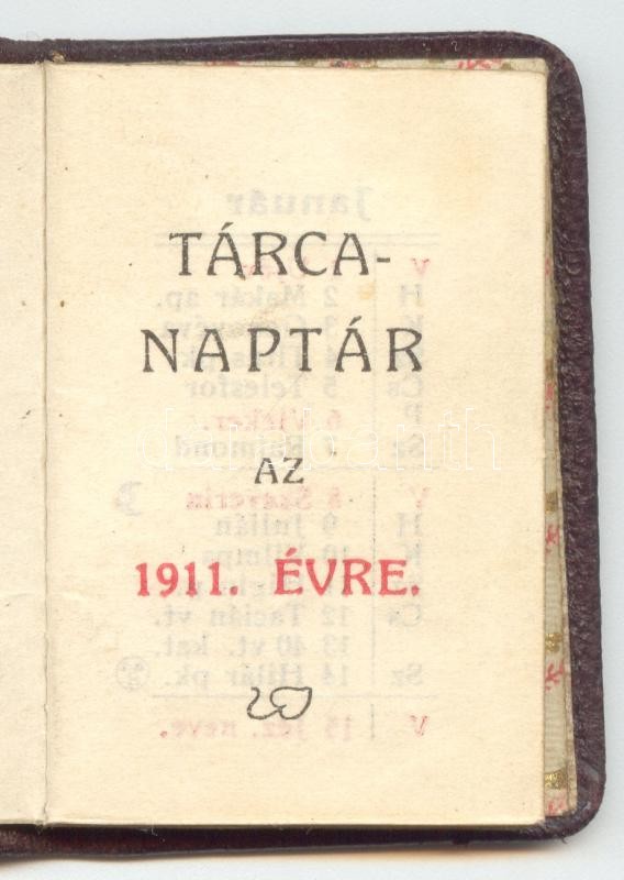 1911 Tárcanaptár igényes egészbőr kötésben, aranyozott lapszélekkel https://www.darabanth.com/de/174-Fernauktion/174.0/Andere-Sammelgebiete/Drucksachen~2200040/1911-Tarcanaptar-igenyes-egeszbor-kotesben-aranyozott-lapszelekkel~II597393